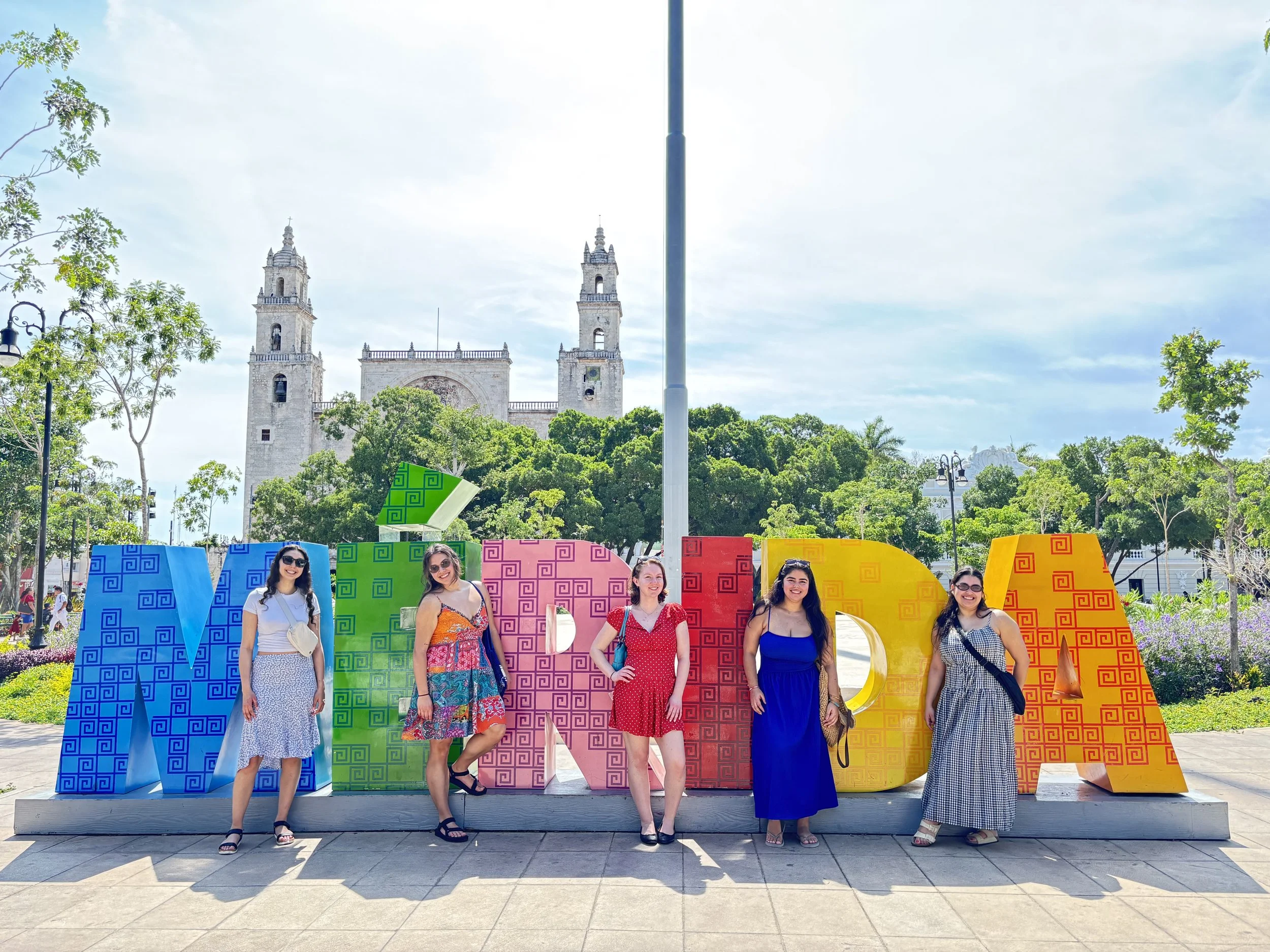 Outdoor pool and patio with lounge chairs, shade sail, and mural artwork on wall.