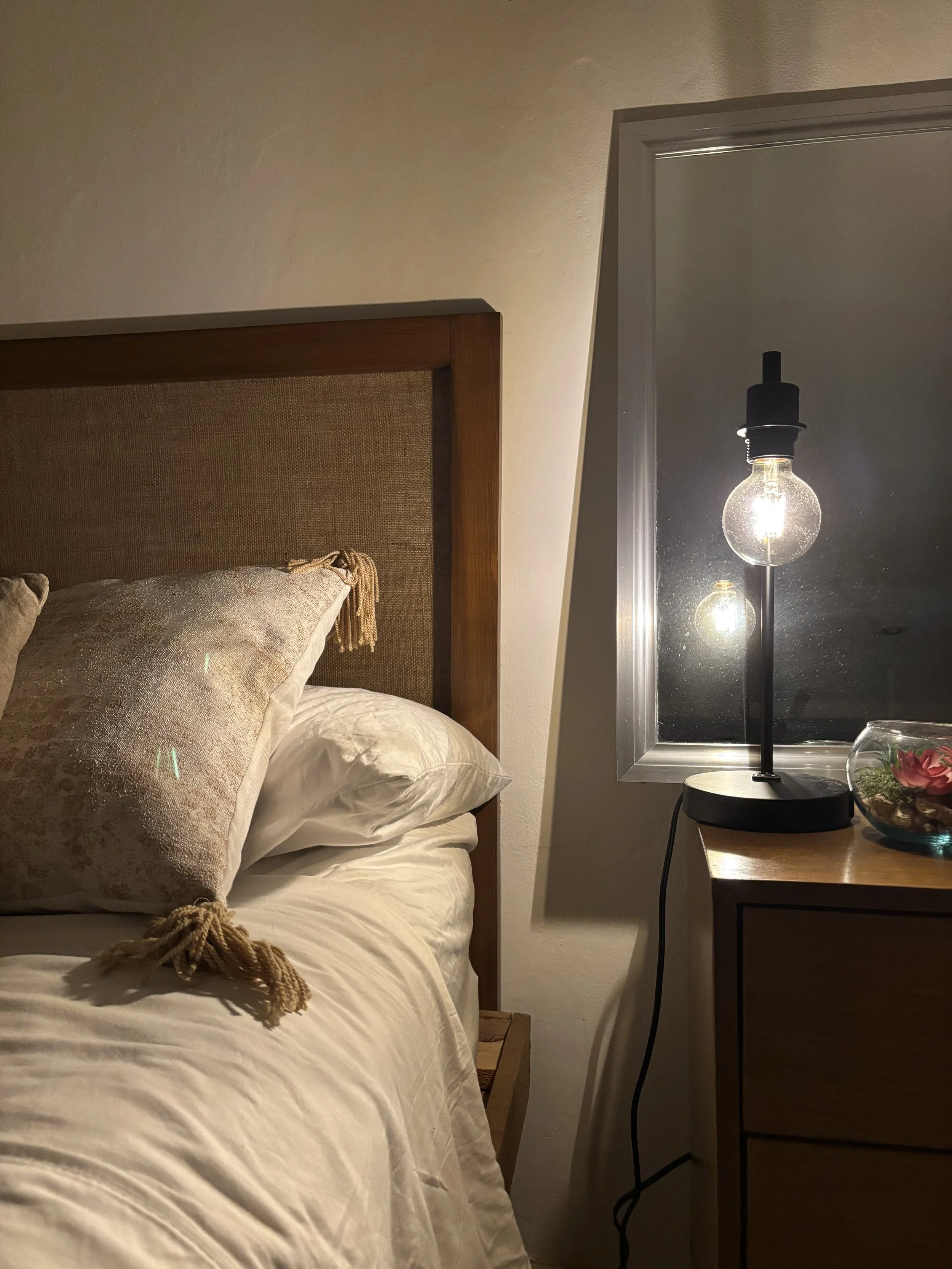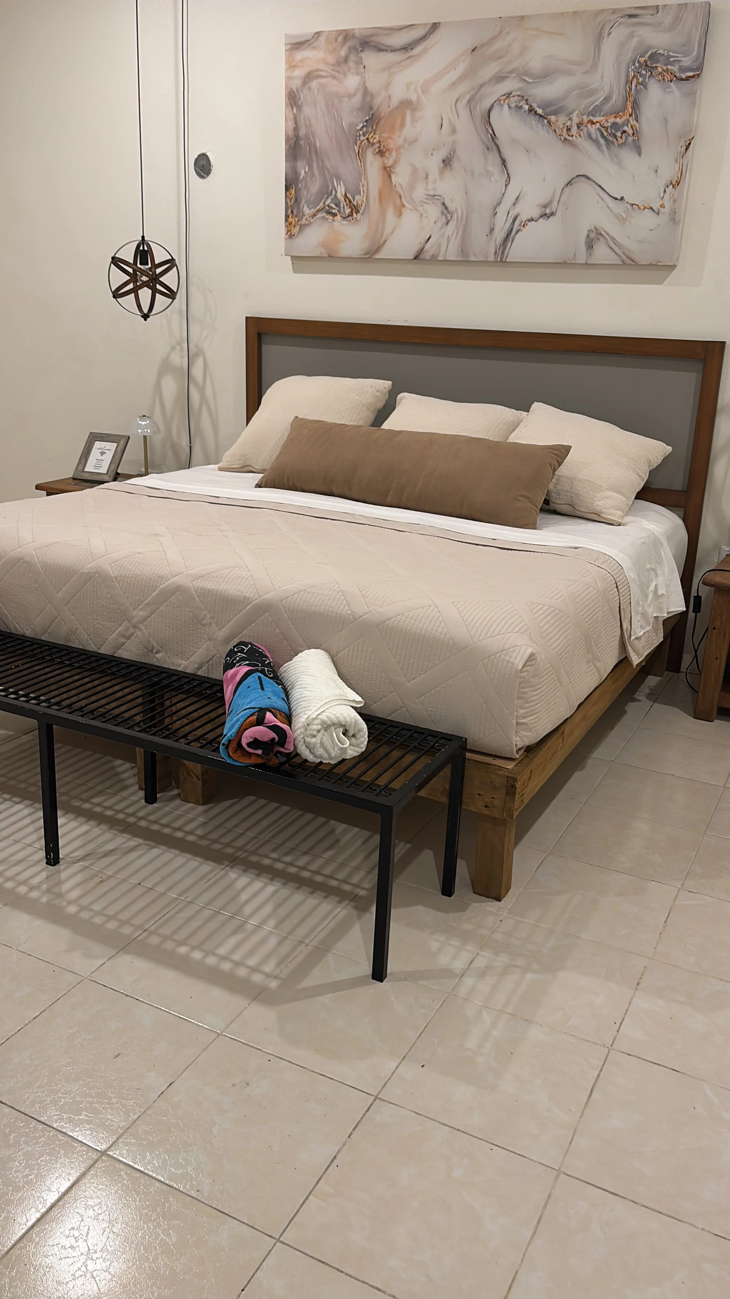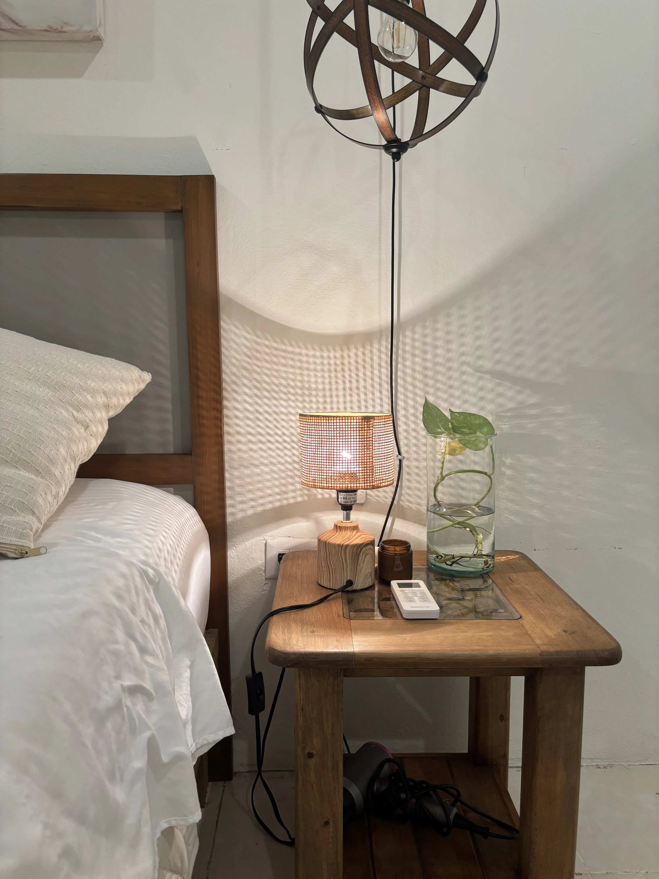 Minimalist bedroom with a wooden bed, black bedding, and pillows. Abstract artwork above the bed, modern pendant lights, and a small table with a plant.