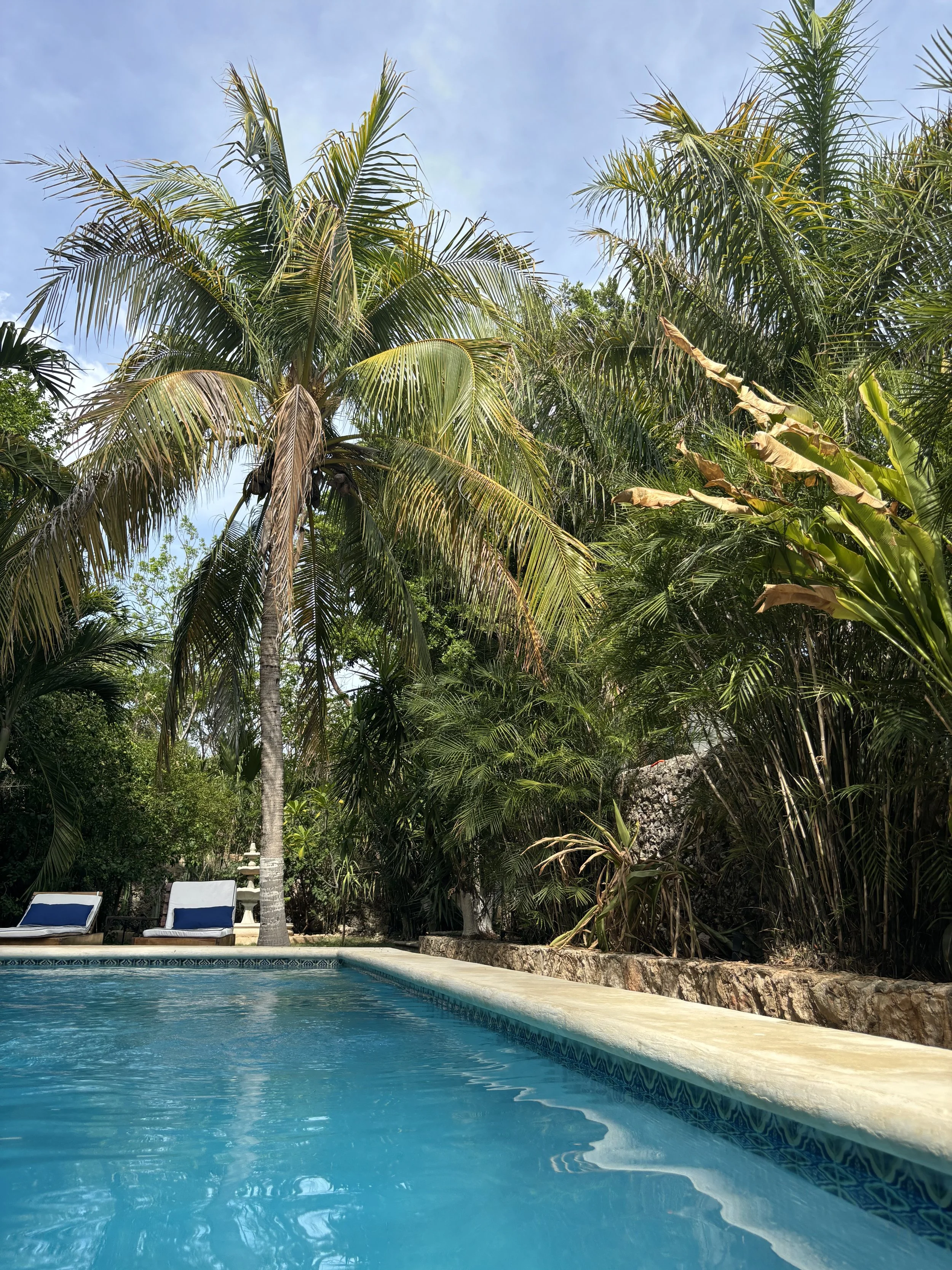 Outdoor swimming pool with lounge chairs and tropical palm trees