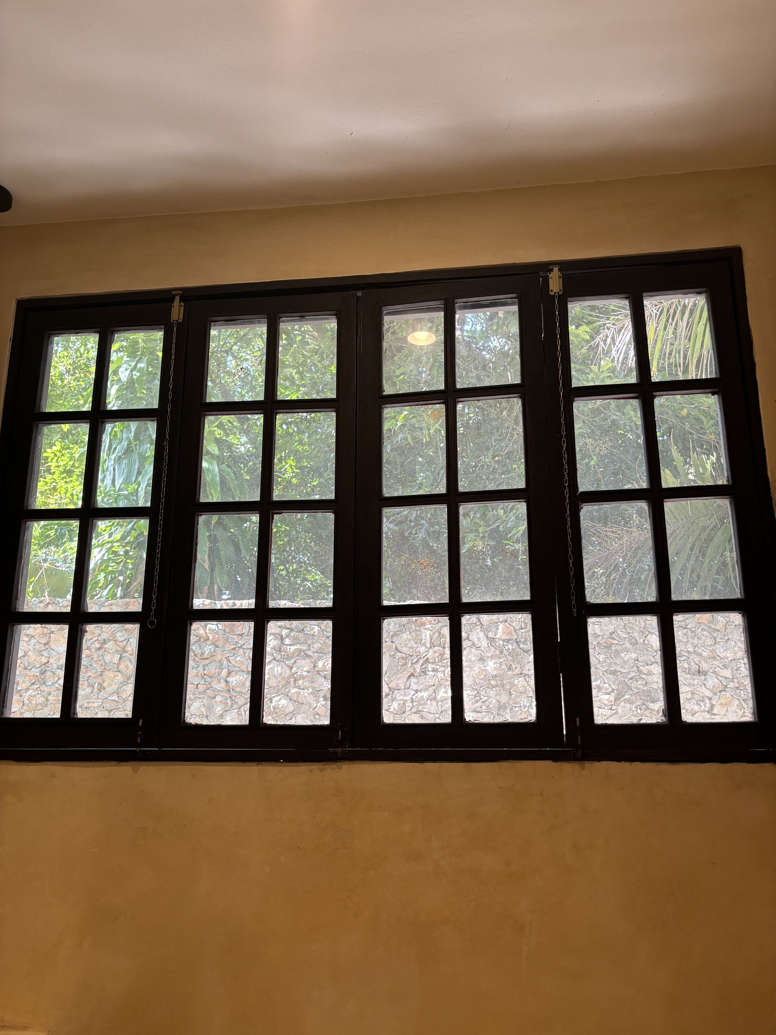 White building with three black iron doors, surrounded by tropical plants and trees in a garden setting.