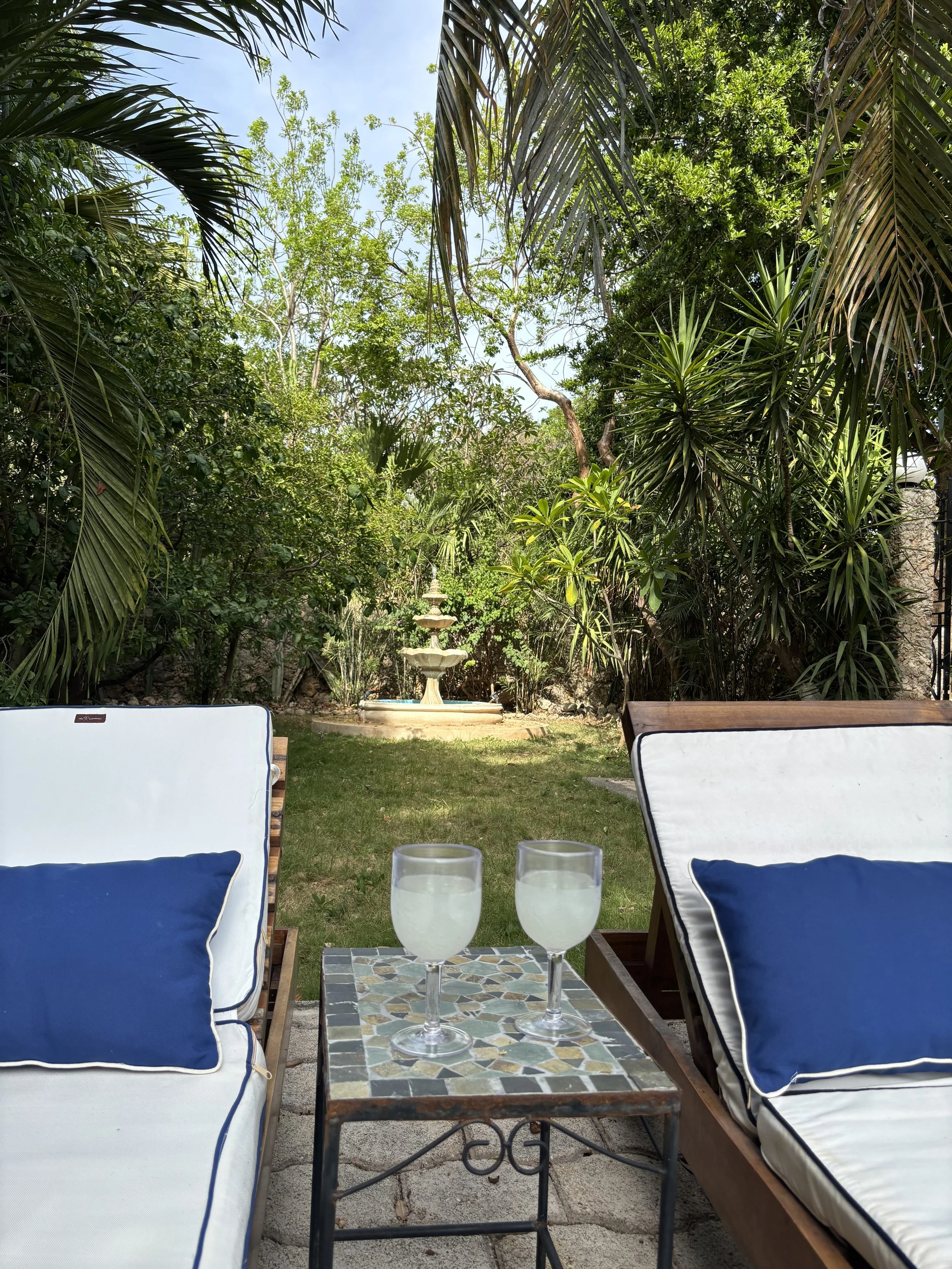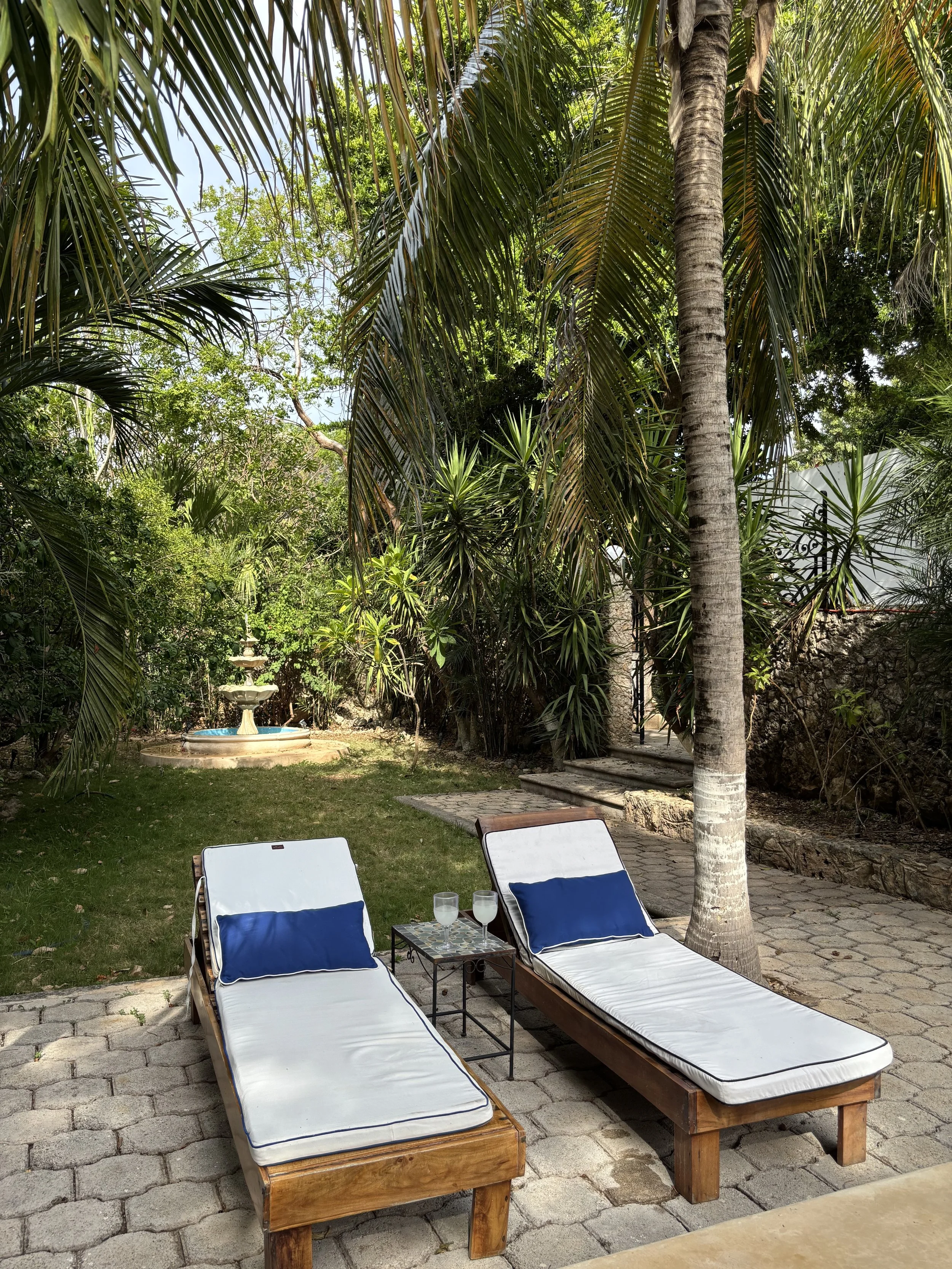 Outdoor patio with two wooden lounge chairs, a small wooden table with a potted plant, a terracotta pot with a palm, and a stone wall backdrop.